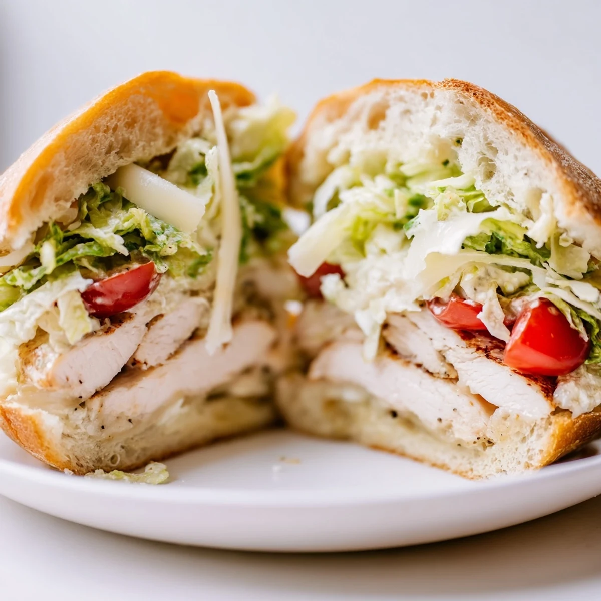 This hearty sandwich transforms the classic Caesar salad into a satisfying handheld meal. Grilled chicken breasts are seasoned simply and cooked until perfectly juicy, then paired with crisp shredded romaine and a rich, tangy homemade Caesar dressing.