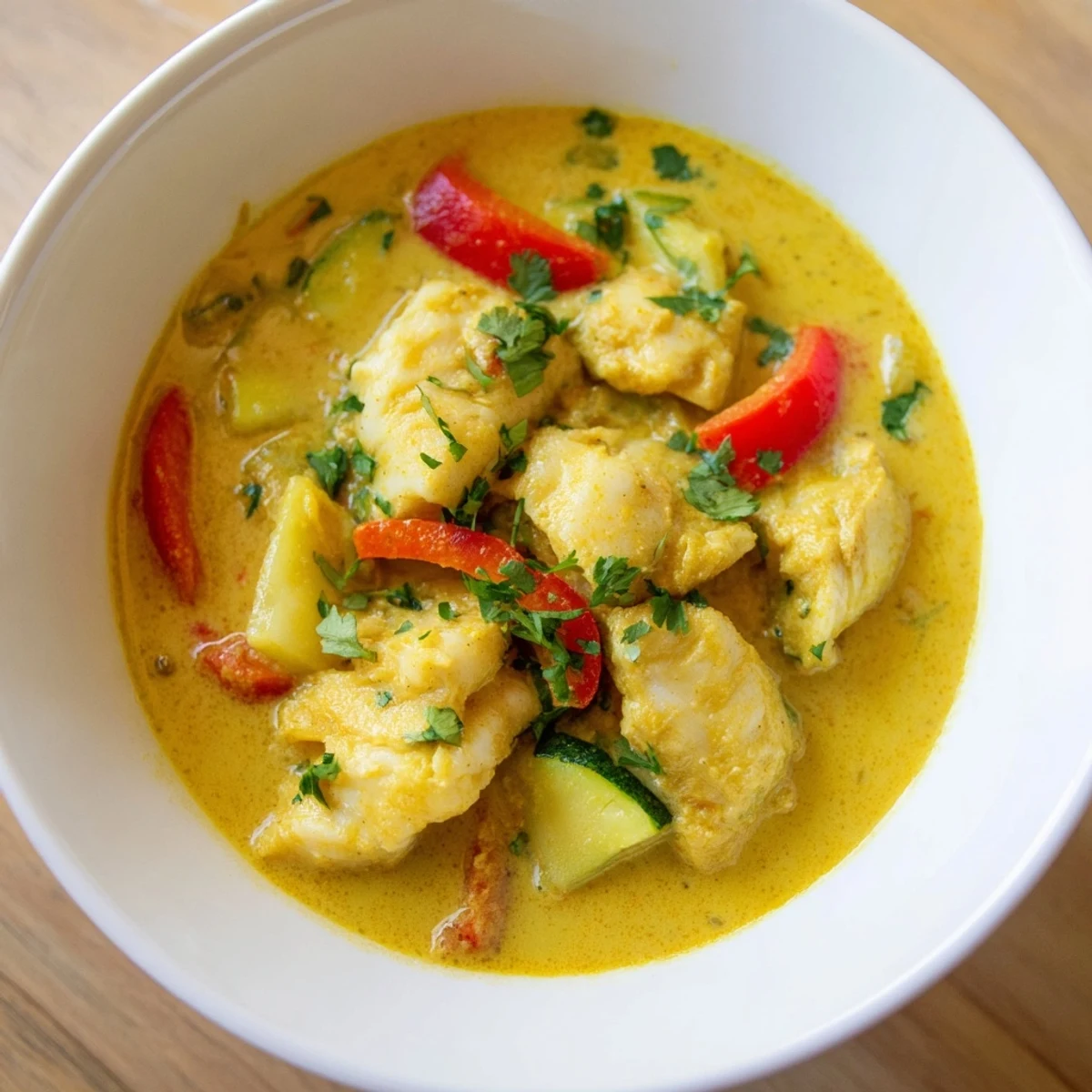 This light and aromatic stew features tender chunks of white fish simmered gently in a rich coconut milk base. The broth gets depth from fish sauce and warmth from ginger, turmeric, and coriander, while fresh vegetables like bell pepper, carrot, and zucchini add texture and color. Ready in under an hour, this coastal-inspired bowl balances creaminess with bright citrus notes from lime.