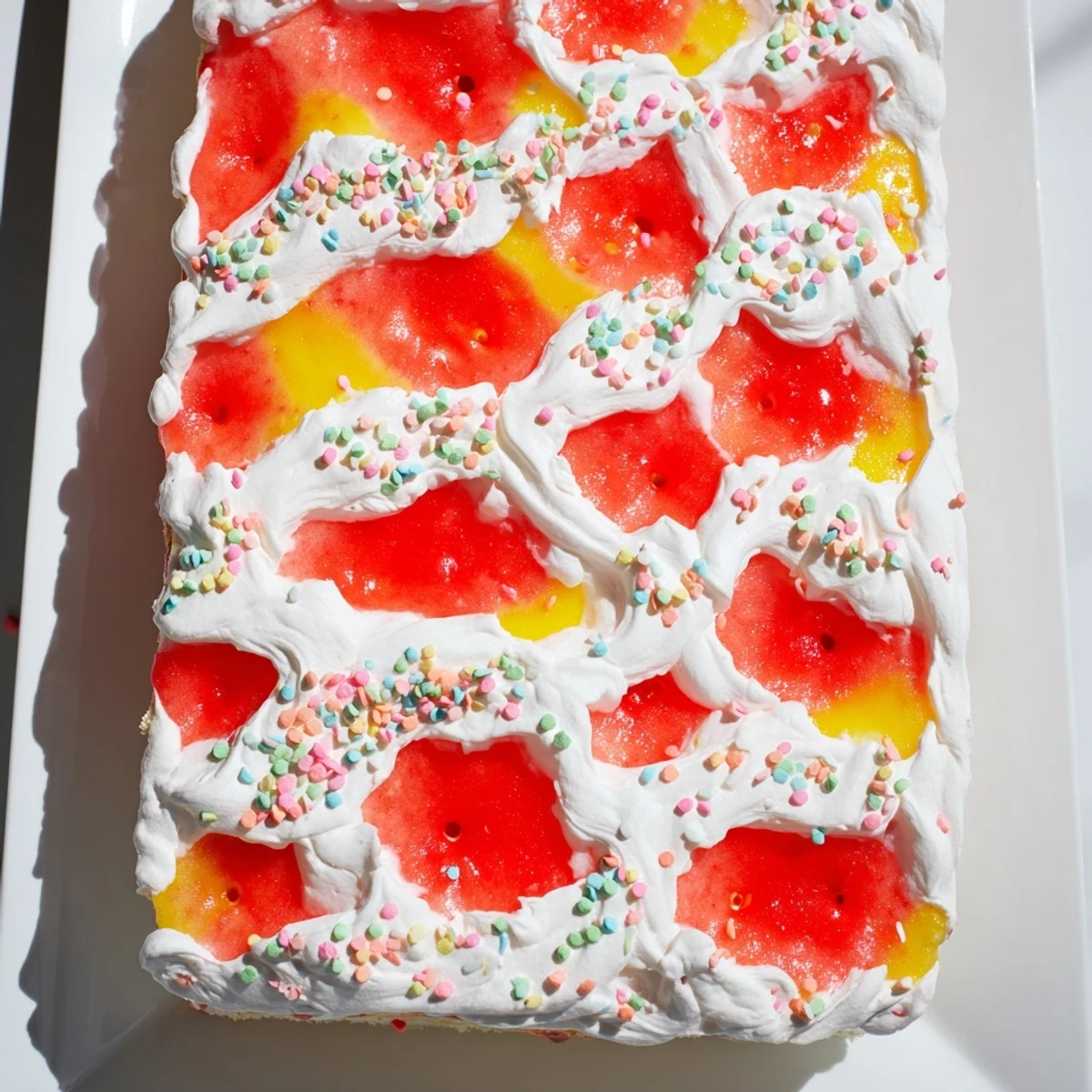 This vibrant spring dessert starts with a moist vanilla cake base, still warm from the oven. The magic happens when you poke holes throughout the cake and pour in bright strawberry and lemon gelatin mixtures, which seep into every crevice creating colorful pockets of fruity flavor. After chilling until set, the entire creation is crowned with clouds of sweetened whipped cream and decorated with festive pastel sprinkles. The result is a cool, creamy, refreshingly fruity treat that's as beautiful to serve as it is delicious to eat.