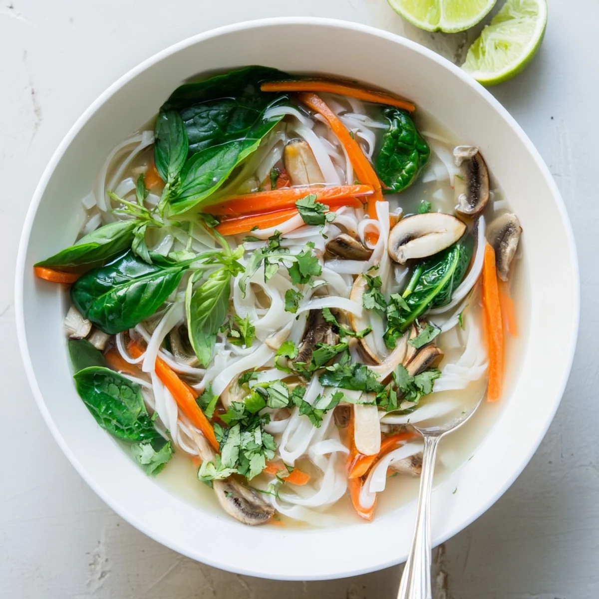 - Top each bowl with fresh cilantro torn basil and lime wedges. Let everyone squeeze their own lime and add any extra toppings they want at the table.