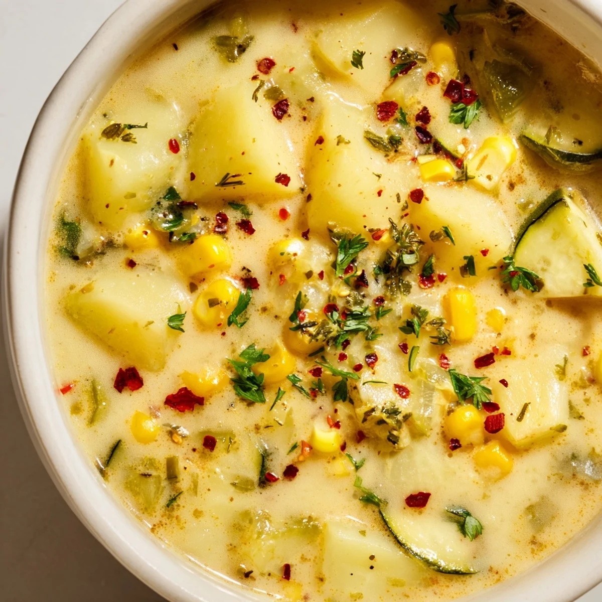 The first time I made this soup was on a rainy Tuesday when my refrigerator was full of random vegetables that needed using. I threw everything in the pot without much expectation, but somehow the combination of sweet corn, creamy potatoes, and tender zucchini created something magical. Now it is the soup my kids request whenever the weather turns gray.