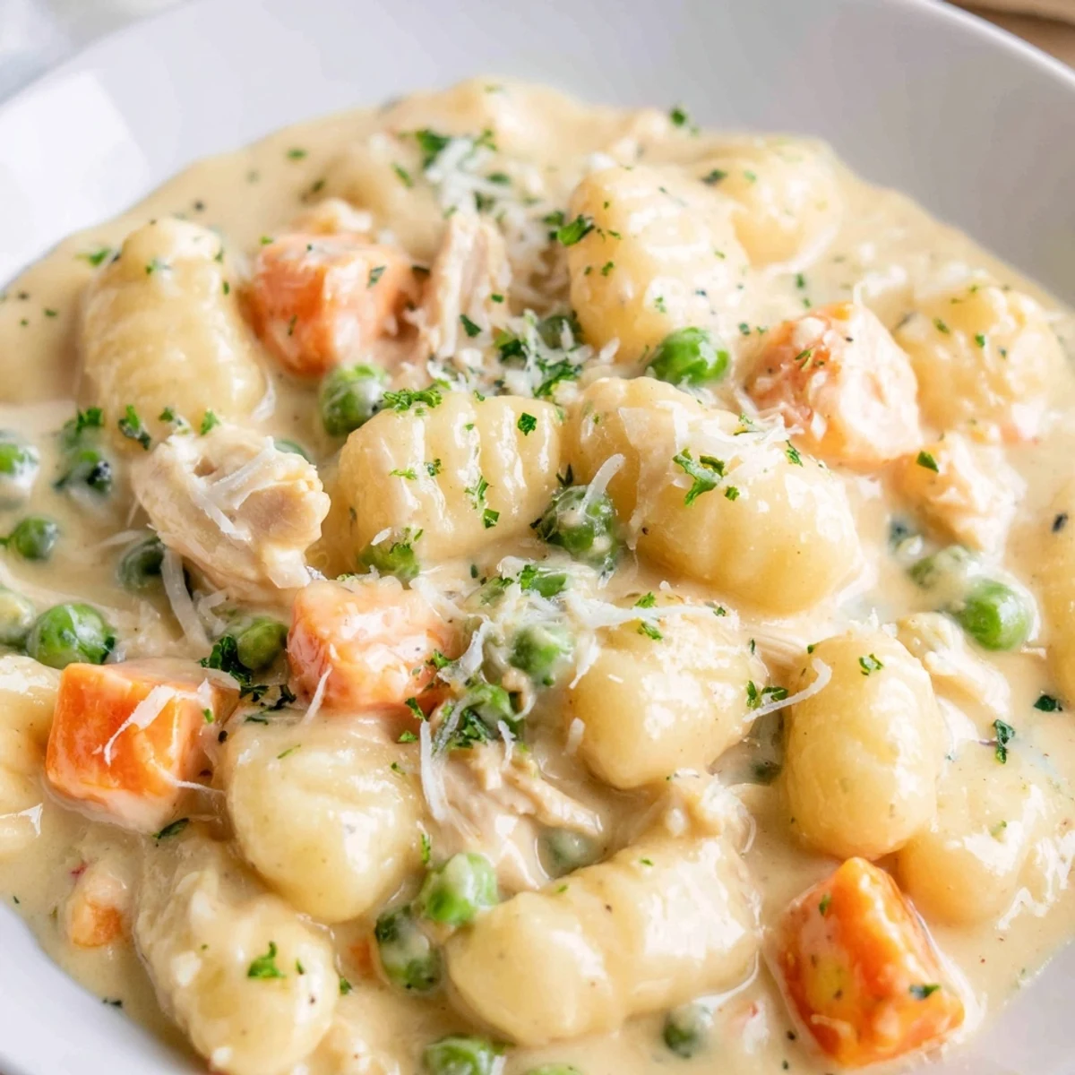 - Gently fold in the uncooked gnocchi, shredded chicken, and frozen peas, making sure the gnocchi are mostly submerged in the sauce