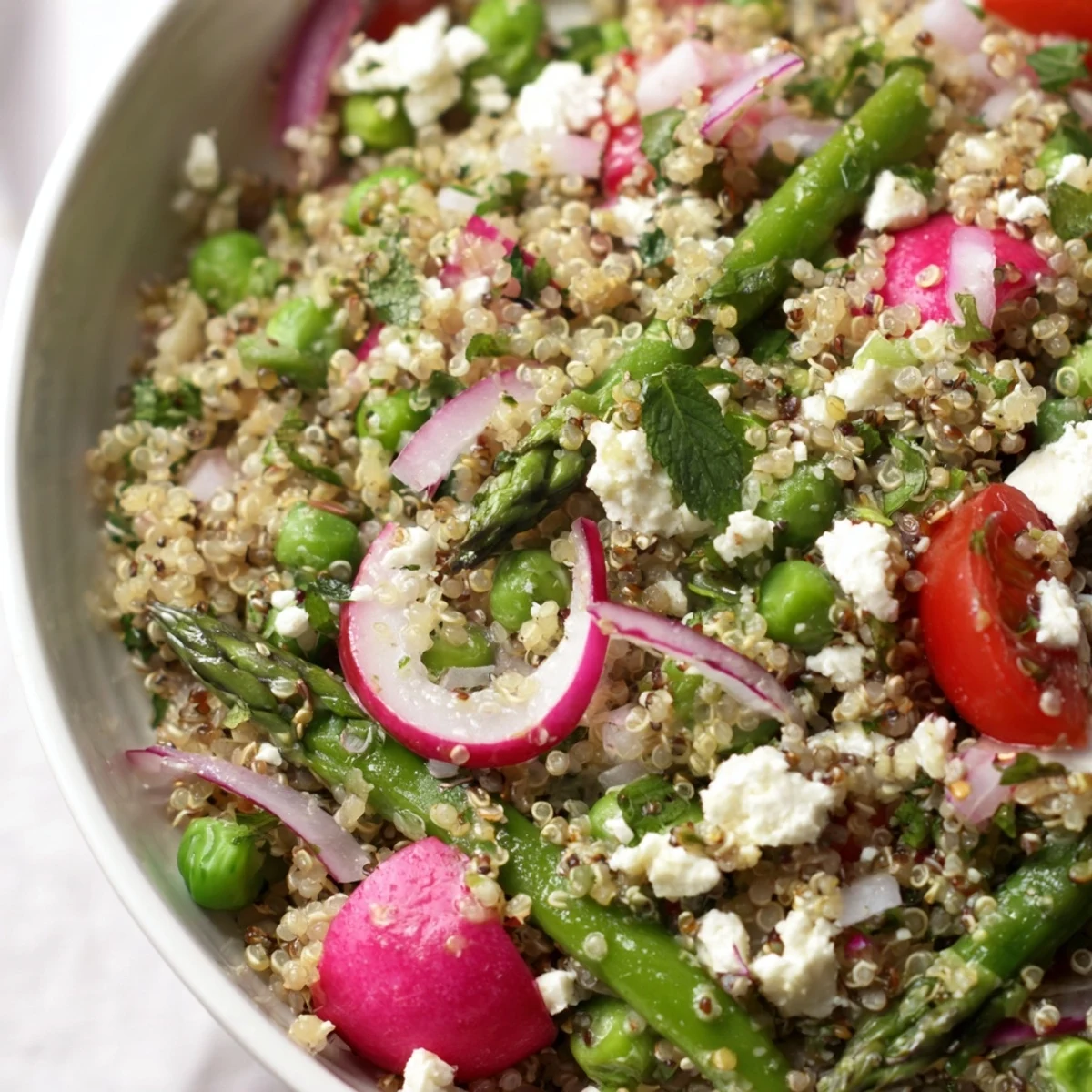 This vibrant bowl combines protein-rich quinoa with seasonal favorites like crisp asparagus, sugar snap peas, radishes, and sweet cherry tomatoes. The vegetables are briefly blanched to preserve their bright color and satisfying crunch, then tossed with fluffy cooled quinoa and fresh herbs including parsley, mint, and chives.